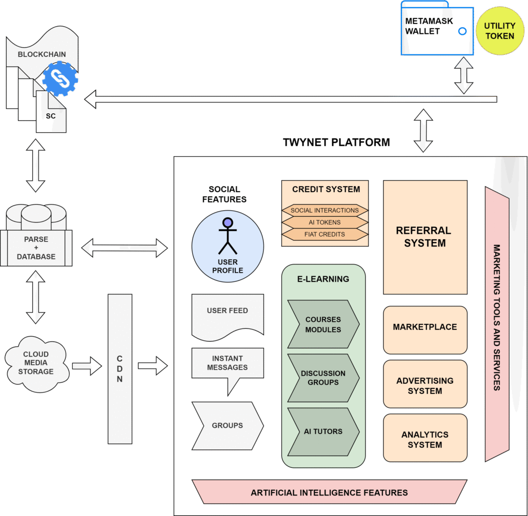 La piattaforma Twynet è composta da diverse tecnologie e funzionalità interconnesse a vari livelli. Il sistema è altamente complesso a causa della presenza di sistemi di monetizzazione ibridi, che operano sia on-chain, attraverso smart contract e crypto-assets, sia off-chain, utilizzando sistemi di credito virtuali interni.