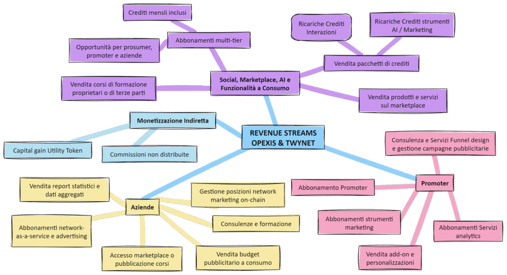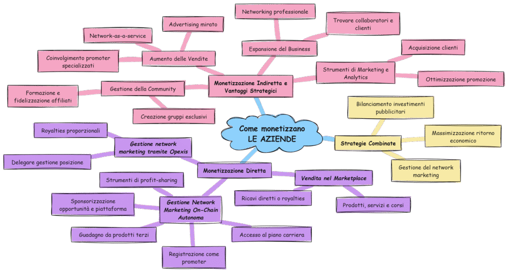 Le aziende che operano su Twynet possono combinare più strategie di monetizzazione, bilanciando investimenti in advertising, vendite e gestione del network marketing per ottenere il massimo ritorno economico.
