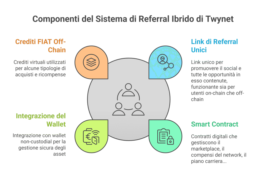 Il sistema di referral ibrido di Twynet combina tecnologie off-chain e on-chain per integrare funzionalità avanzate di network marketing e sharing economy.
